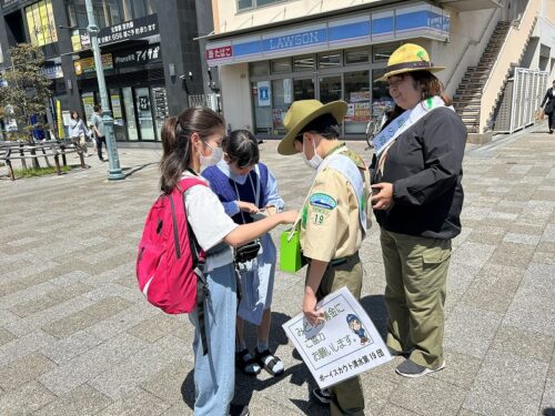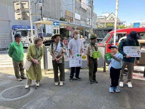 ボーイスカウト清水19団の活動今年の「みどりの募金」は、JR清水駅前で2チームに分かれて実施しました