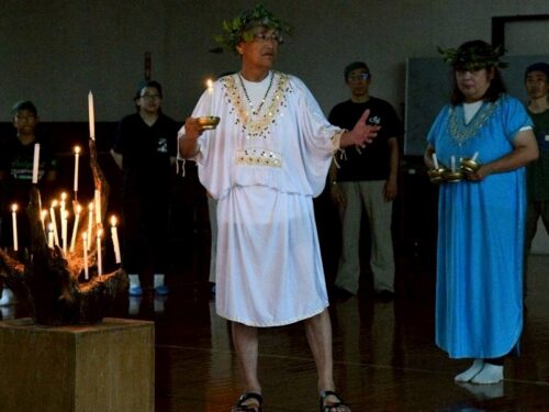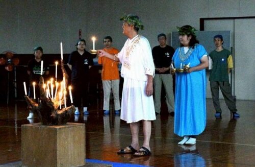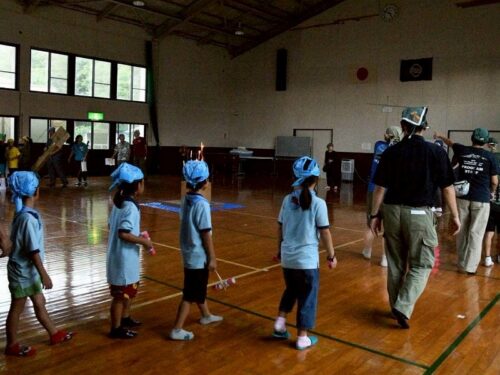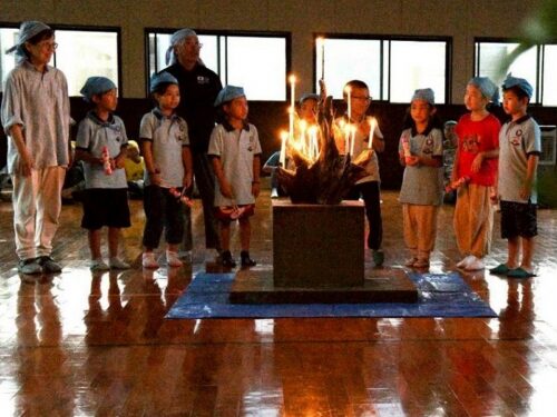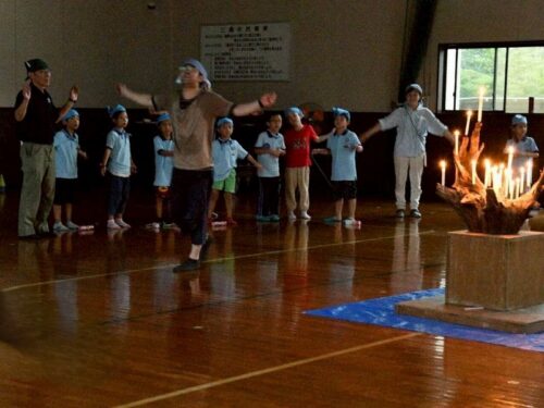 計画では屋外の大営火場で開催予定でしたが、前日までの雨でコンディションが悪く、室内での
